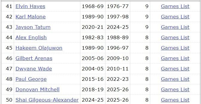 根据数据统计,这是米切尔生涯第9场45+,他超越韦德、乔治、亚历山大等人,追平塔图姆、卡尔·马龙等,并列NBA历史45+场次榜第41位。